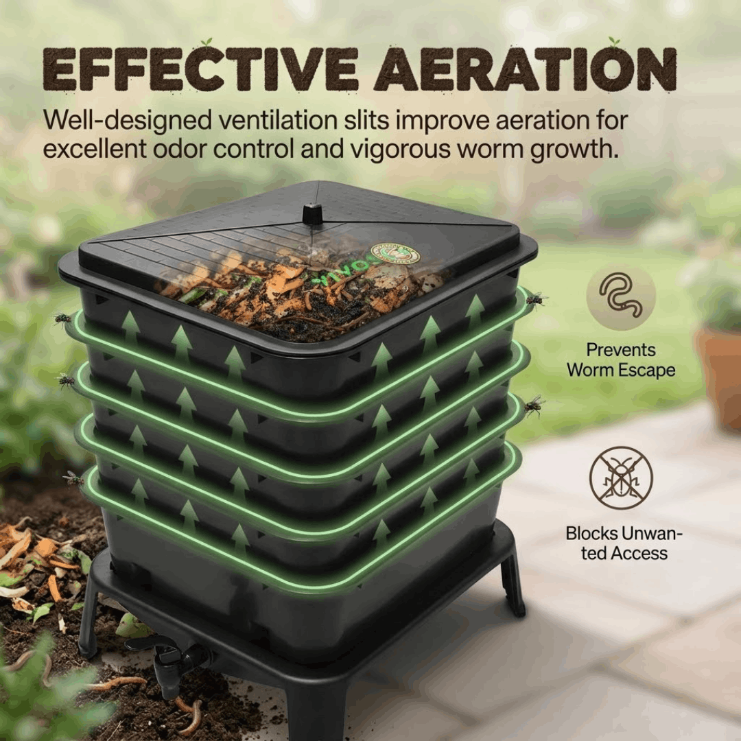 It doesn’t smell. Not if you run it right — and the Worm Tower is designed to help you run it right. Ventilation slits throughout every tray keep air moving, worms active, and decomposition clean. No ammonia. No rot smell. Nothing your family is going to complain about.